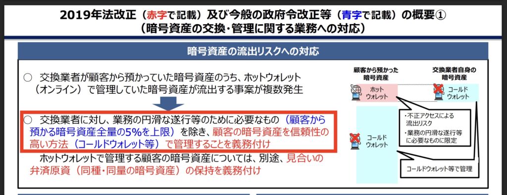 国内取引所は顧客から預かった資産の95%以上を、コールドウォレットなどの安全な方法で管理することが、資金決済法によって義務付けられています。