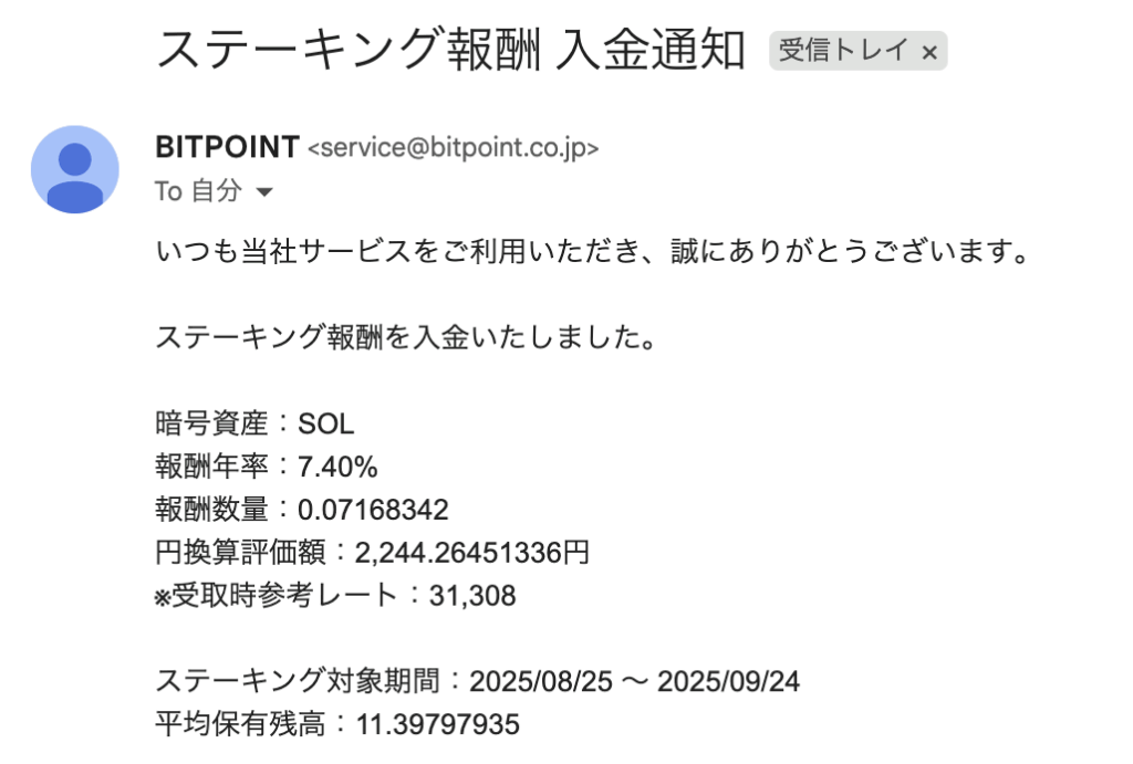【2025年9月分】 BITPOINTでSOLをステーキングした感想